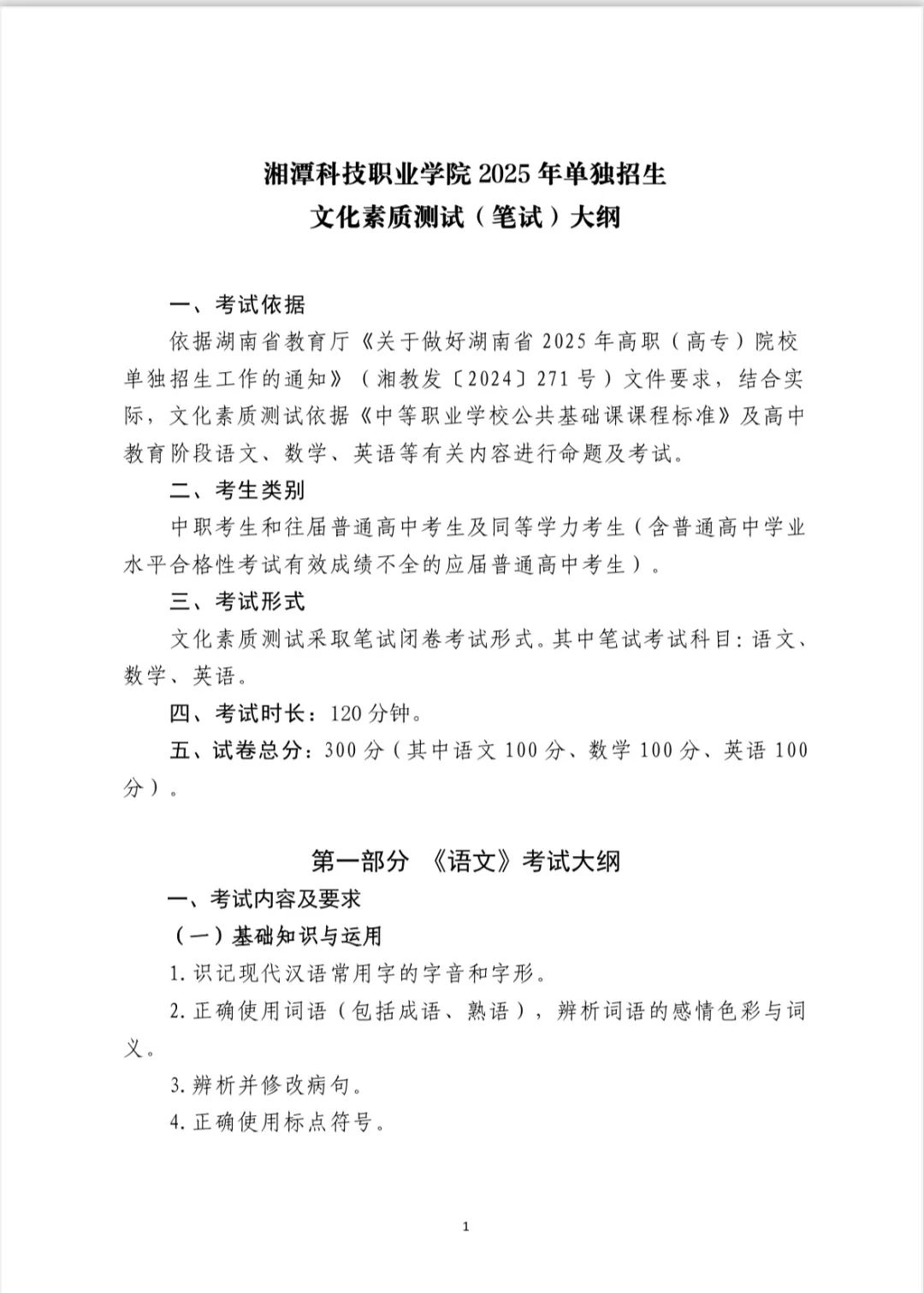 湘潭科技职业学院2025年单招考试大纲