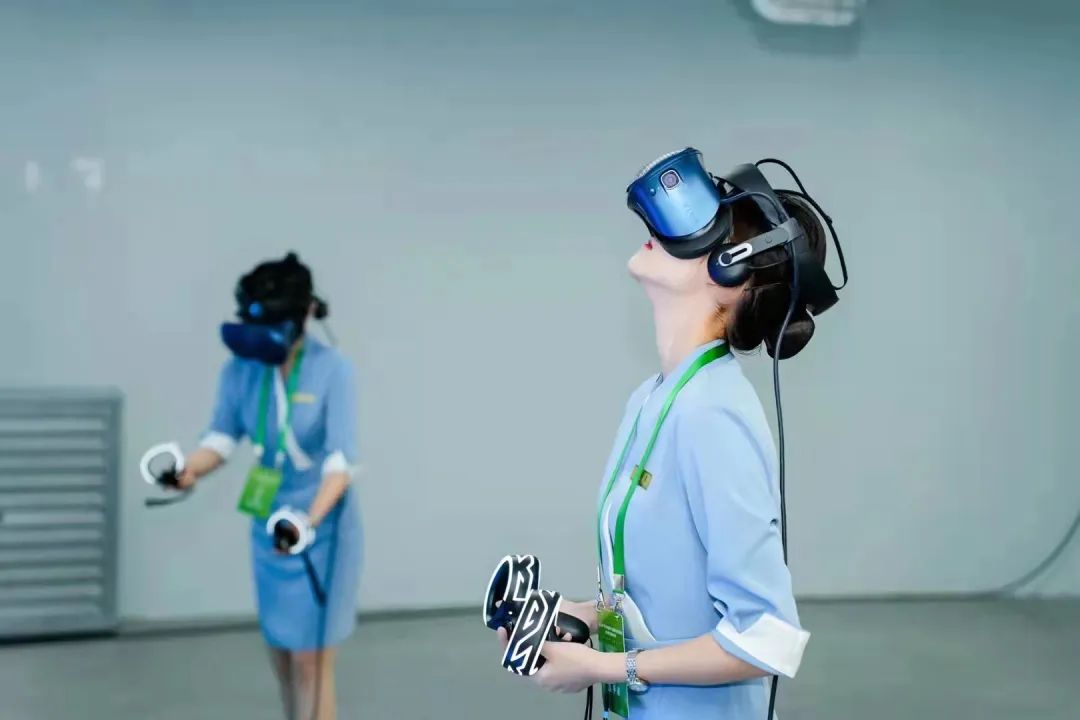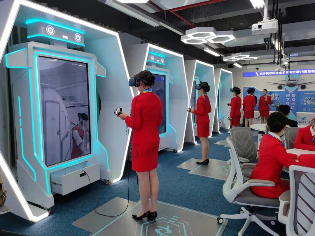 ▲我校空中乘务专业学生进行客舱特情VR处置实训