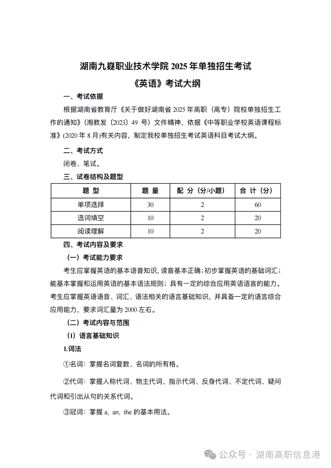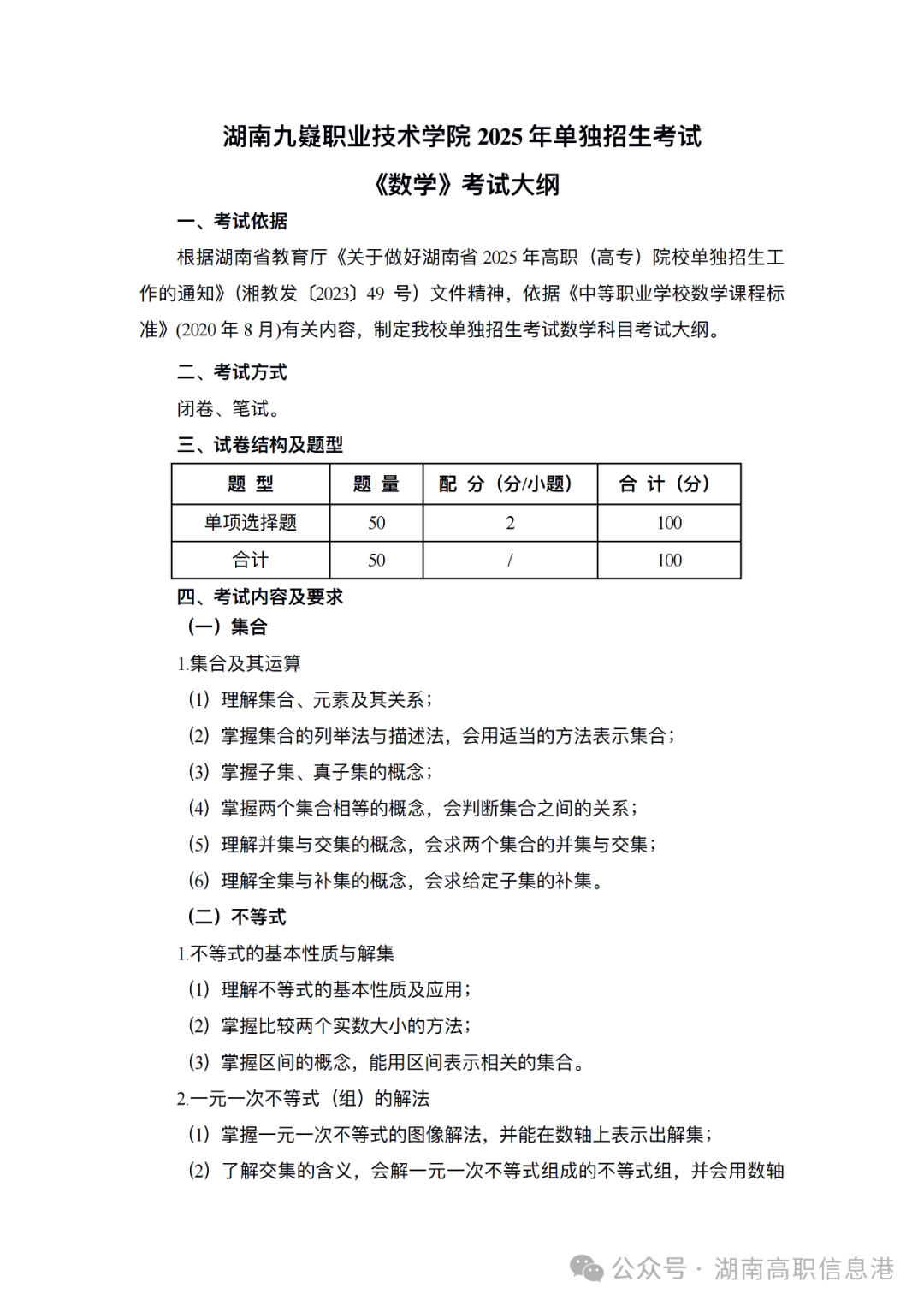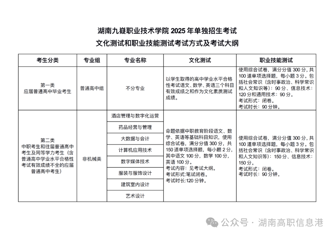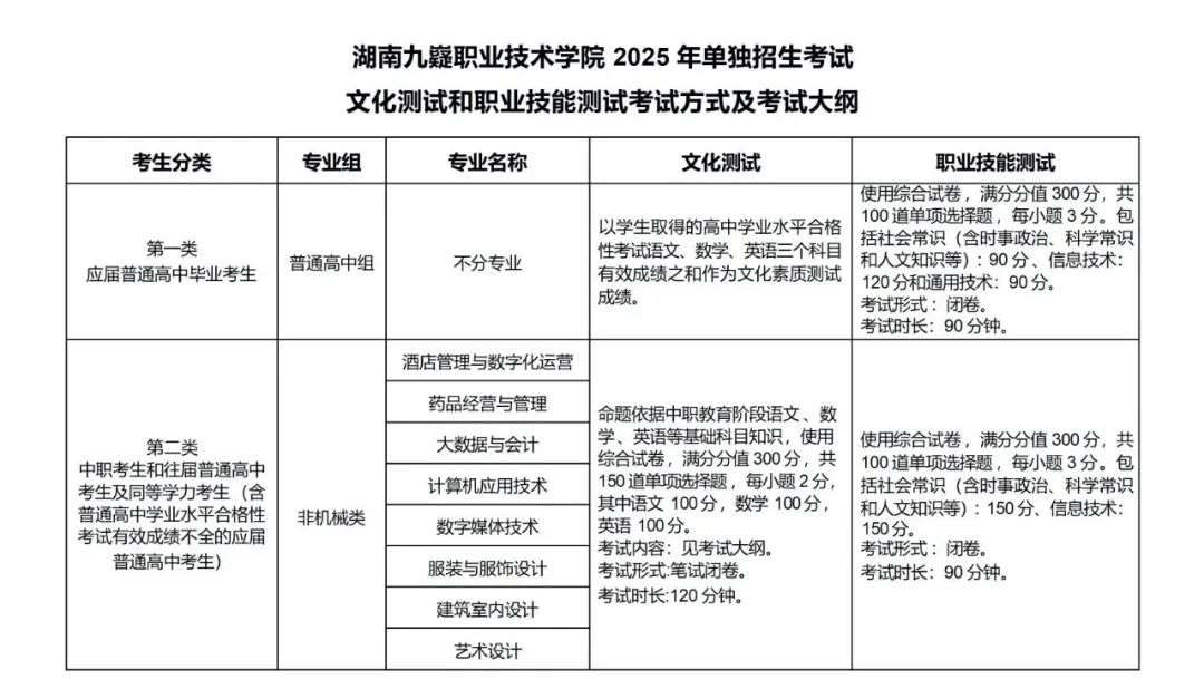 2025年湖南九嶷职业技术学院单独招生考试大纲