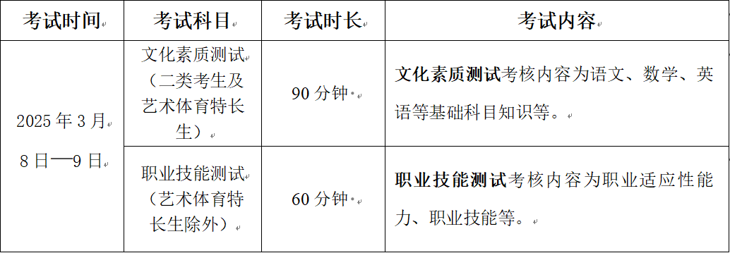 3.退役军人及其他社会人员。退役军人、农民工等社会人员考生免予文化素质测试。职业技能测试由学院组织,采取笔试方式进行,重点考察学生的职业适应性和职业技能,满分300分。